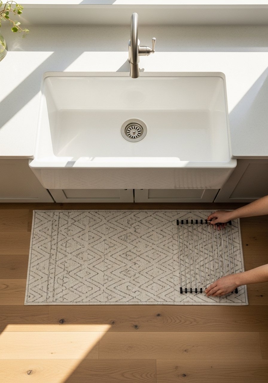 This is where the kitchen stops feeling fragile and starts being usable. Put a waterproof, washable mat directly in front of the sink, and a slim mat at the stove if you stand there a lot. The sink mat should match the sink width or be about two thirds of it. That proportion keeps the mat functional and tidy.
