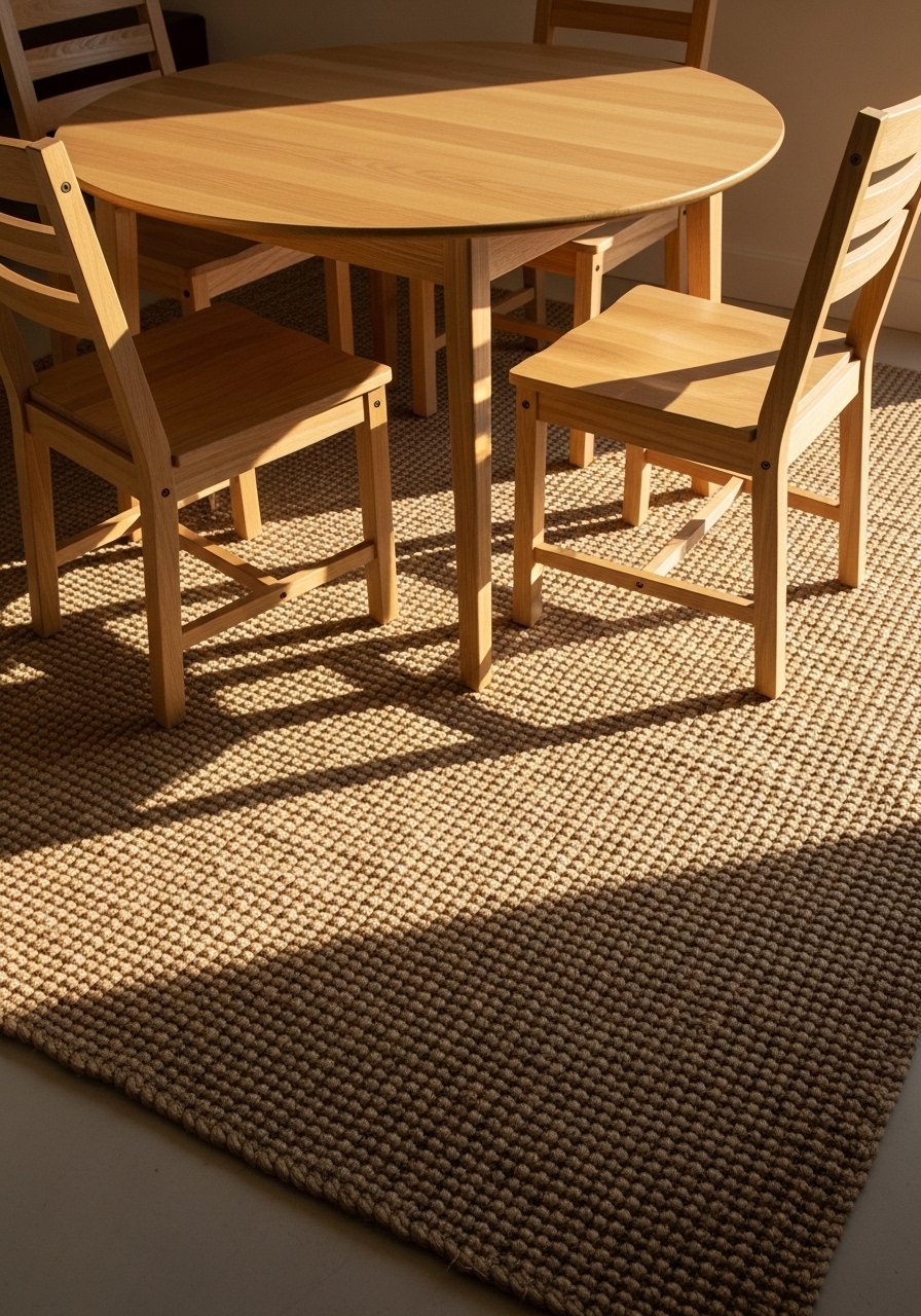 Under a dining table the rug must extend about 24 inches beyond the edge to allow chairs to pull out. For a small two-seat table a 4-foot round or a 5×7 jute pattern often works. When the rug is large enough the area reads as one cozy zone. When it is too small the table looks like it is floating.