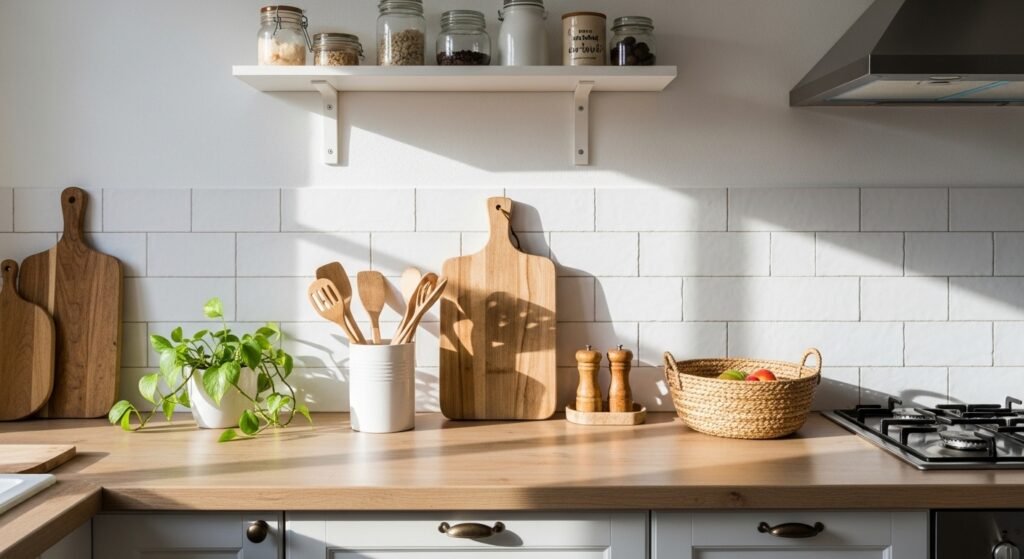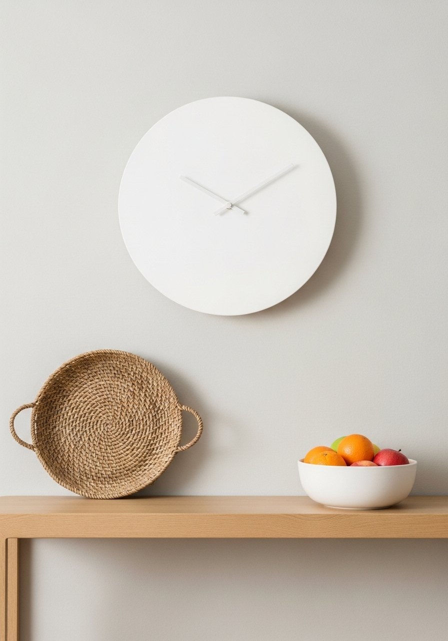 I choose one wall piece — often a Minimalist wall clock, 10" matte black — and keep other wall decor minimal. That single anchor point helps the room feel finished without shouting. Then I create small vignettes: a basket of fruit, a folded linen towel, a canister or two.