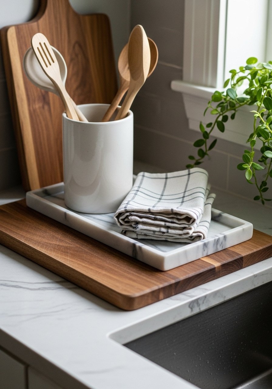In a small kitchen I scale everything down. One tray and one plant can do the job. I use multitasking pieces: a cutting board that also serves as a display base, or canisters that store staples and look tidy.