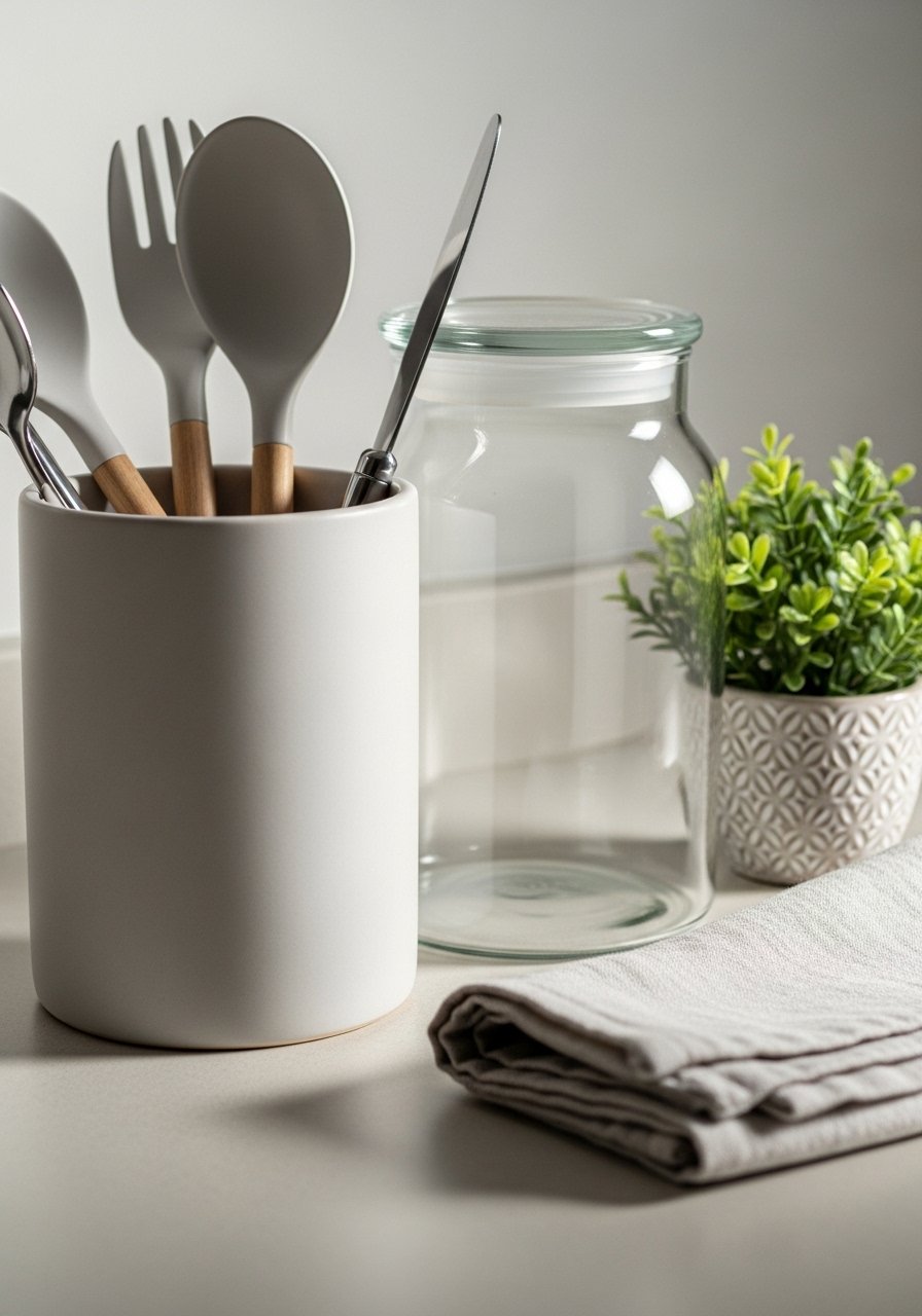 Next I layer three items of different heights — a Matte ceramic utensil holder, white, a glass canister, and a small faux plant. Height and texture stop the eye from sliding over the space. The counter looks balanced, not fussy.