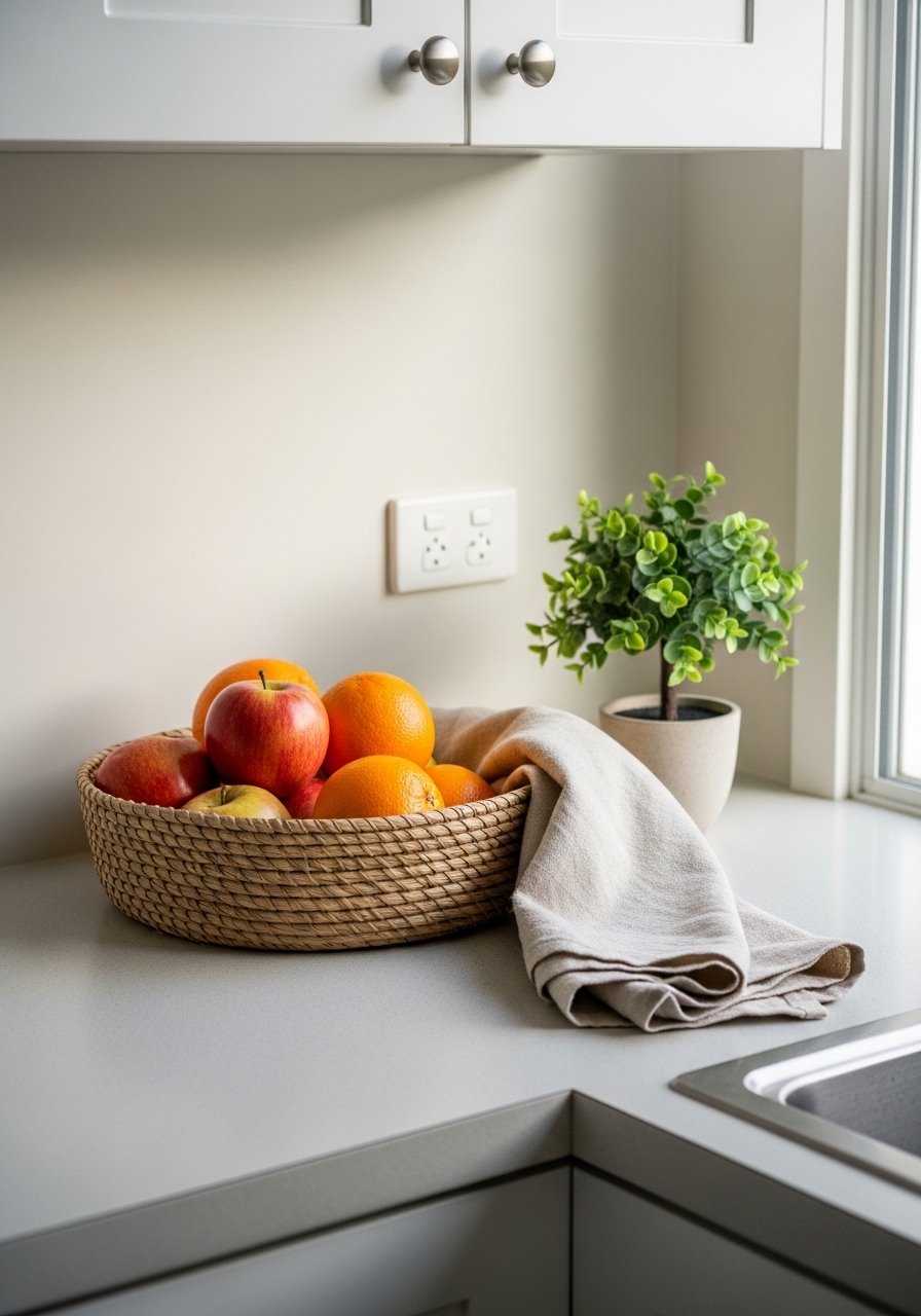 Finally, I make a habit of rotating one item weekly — a different fruit in the basket, a new folded towel, or a small plant moved to the counter. These tiny changes keep the kitchen feeling cared-for and not staged. Visually, rotation prevents the decor from becoming wallpaper.