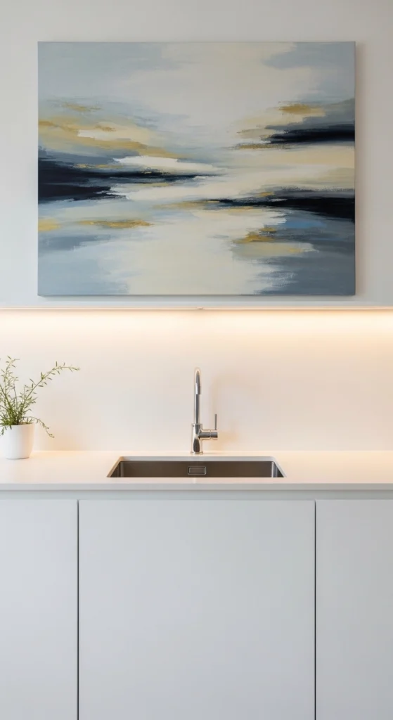 • Neutral kitchens pair beautifully with soft abstracts, botanicals, or typography.