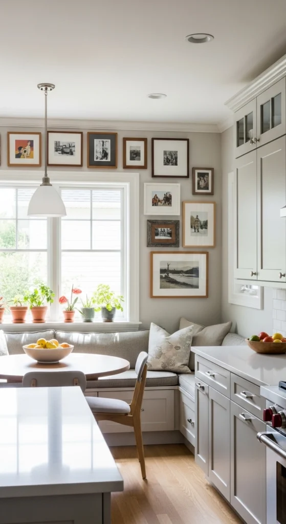 Wall art is one of the safest ways to introduce color into a kitchen—especially if your cabinets are neutral.