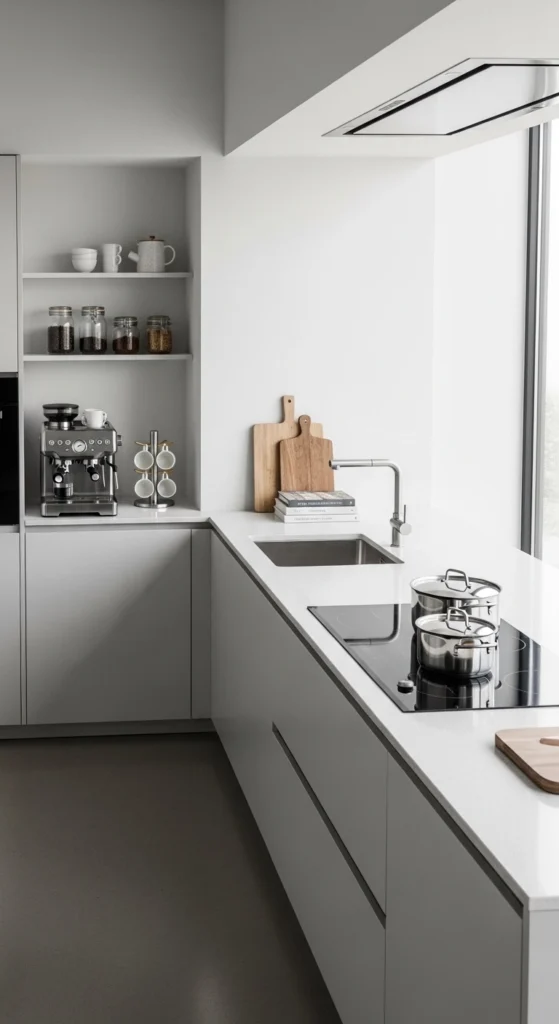 A calm color palette reduces visual noise, making the entire kitchen feel cleaner—even on busy days.