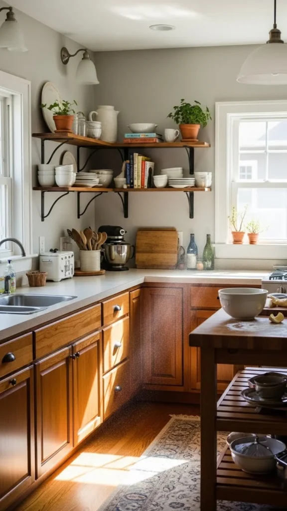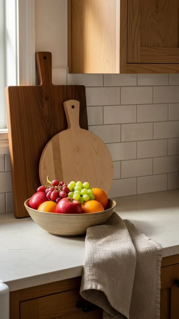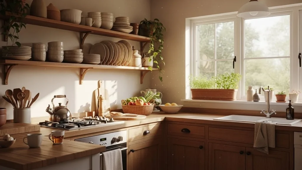 A warm kitchen feels lived-in, not showroom-perfect—but clutter can quickly ruin that feeling.