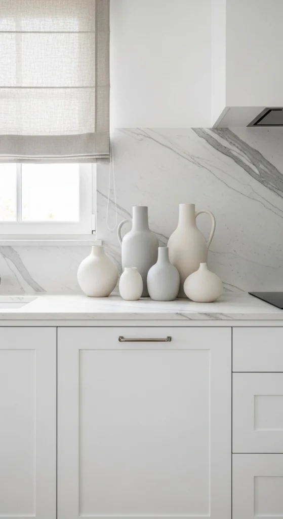 An all-white kitchen can feel sterile if everything blends together. Mixing materials creates contrast while keeping the palette calm.