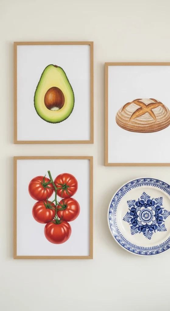 Plates, framed towels, or food-inspired prints work beautifully when they share a visual rhythm.