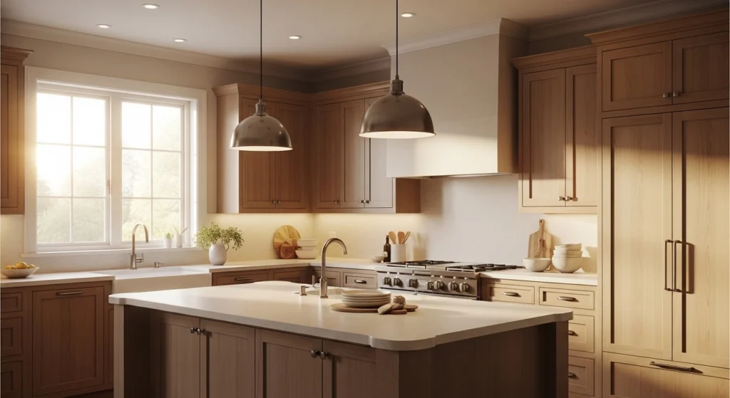 One overhead light feels harsh. Layered lighting fixes that. Add stick-on LED strips under cabinets. They are cheap and renter-friendly. Use warm bulbs for a softer glow. Pendants over an island add focus. This setup helps with prep and makes evening cooking calmer.