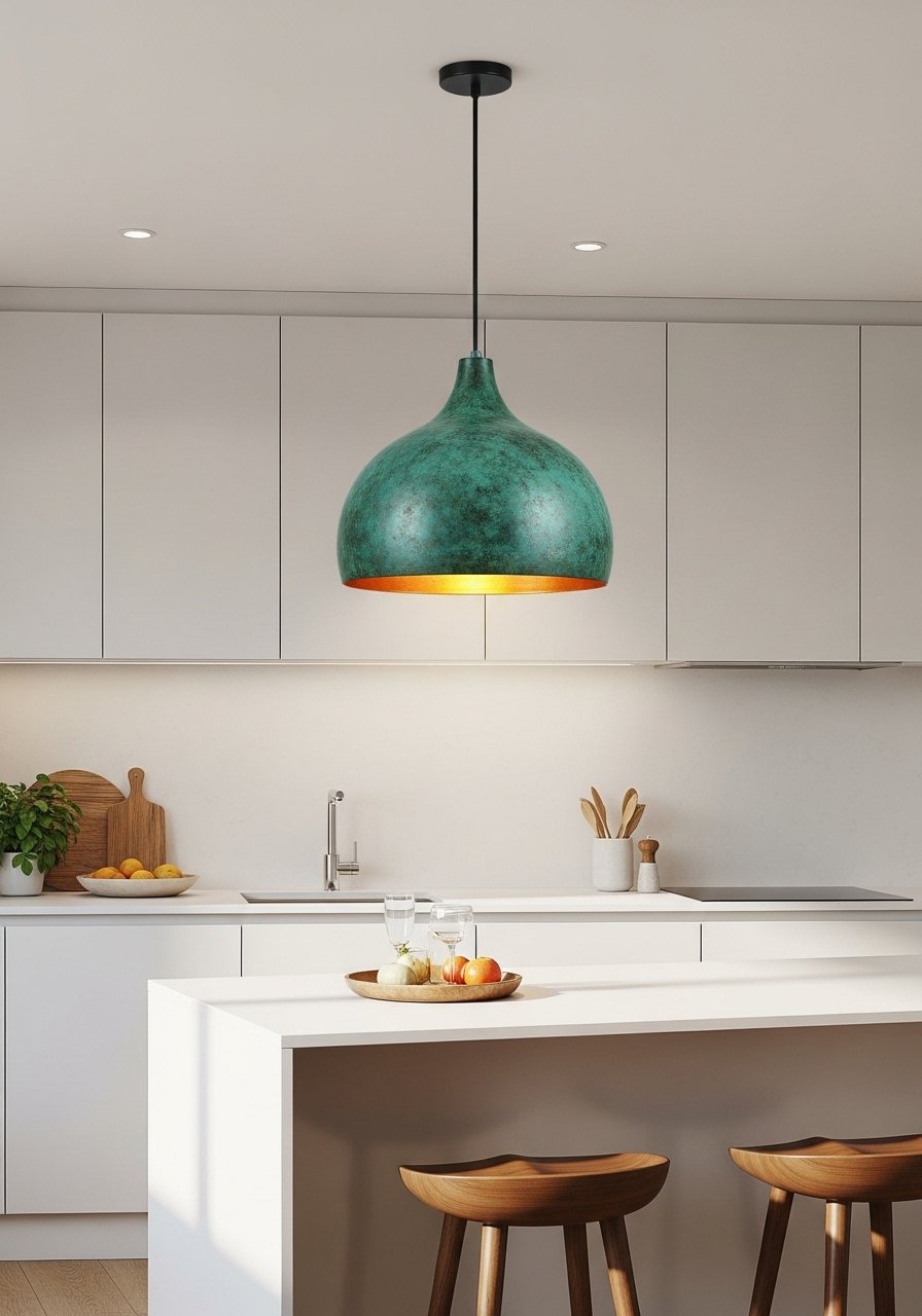 I introduced a verdigris pendant in my white kitchen to add soft color without going bright. The green-blue patina felt grown-in and matched houseplants. I tried a brass pendant first and it looked too shiny next to the fridge. The patina read calmer in daily life.