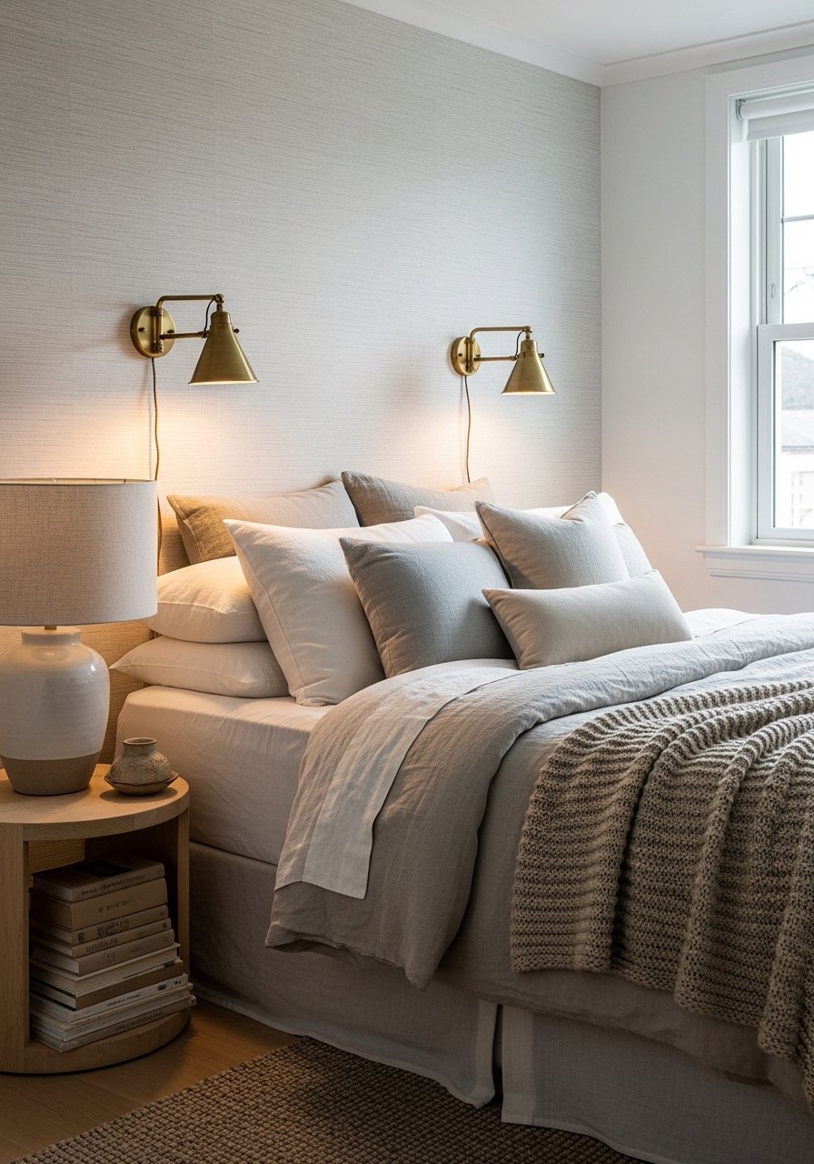 21. Bedside Layering: Sconces + Table Lamp for Flexibility