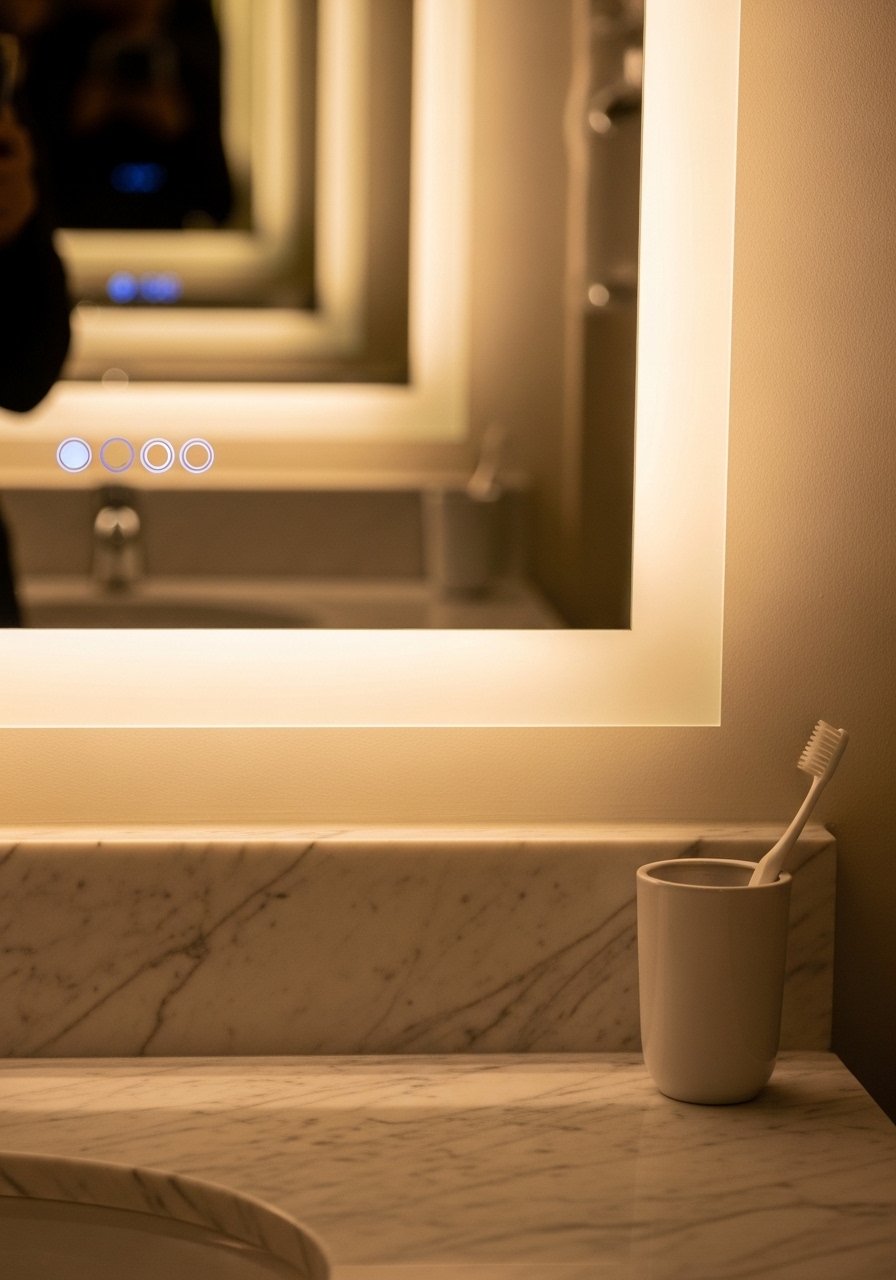 I added a backlit mirror in the bathroom and it feels like a quiet upgrade every morning. The halo light flatters skin and prevents harsh shadows. I had a previous mirror that was front-lit and made my face look flat — the backlight is softer.