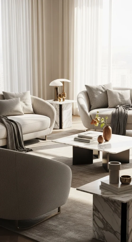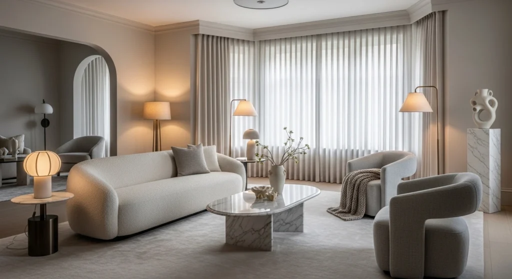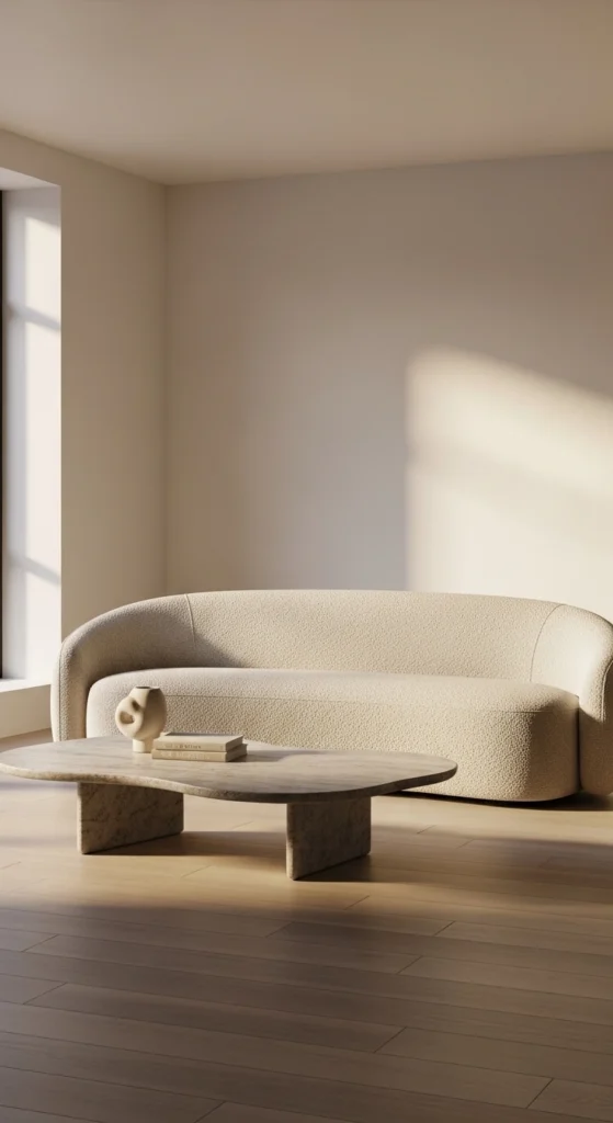 This approach works in small rooms too. Curves help spaces feel open. One strong piece often replaces several weaker ones. That restraint is what gives the room a premium feel.