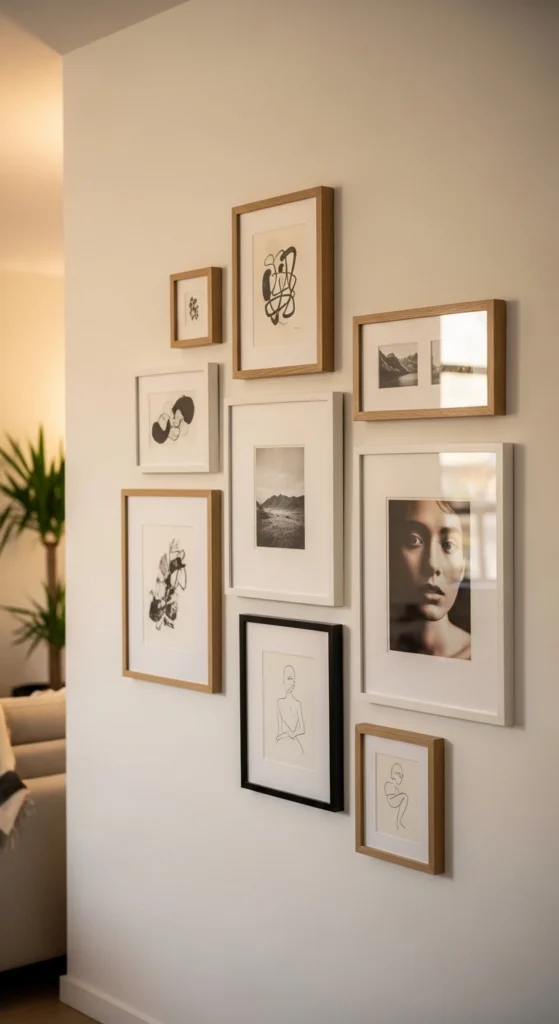 Consistency helps. Use similar frames or matting. This keeps the wall calm.