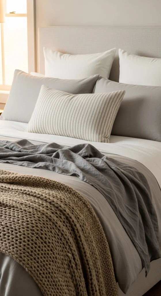 Bedrooms benefit from restraint. Neutral bedding with texture feels calm.