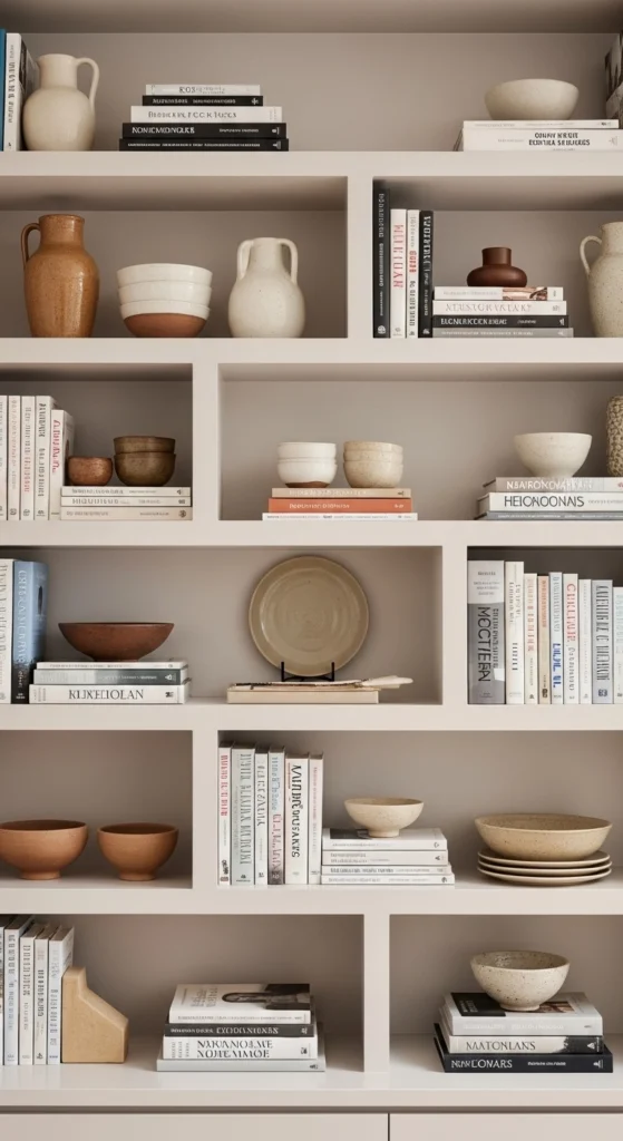 Use neutral book covers or turn spines inward for calm. Add one sculptural piece per shelf.