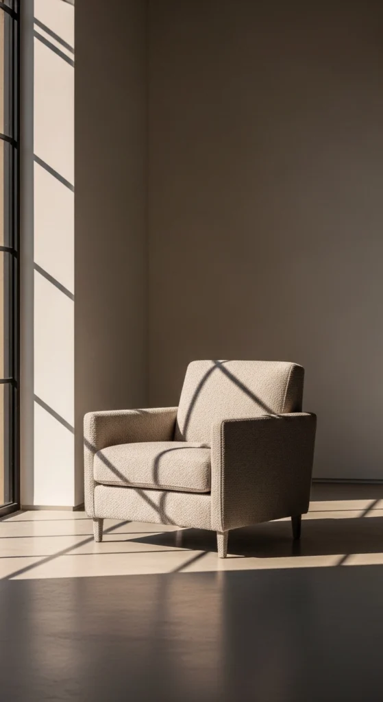 Accent chairs add comfort and form. Choose simple shapes with soft fabric.