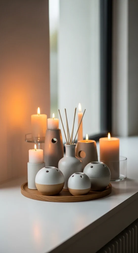 Simple ceramic diffusers or candles work well. Avoid mixing too many.