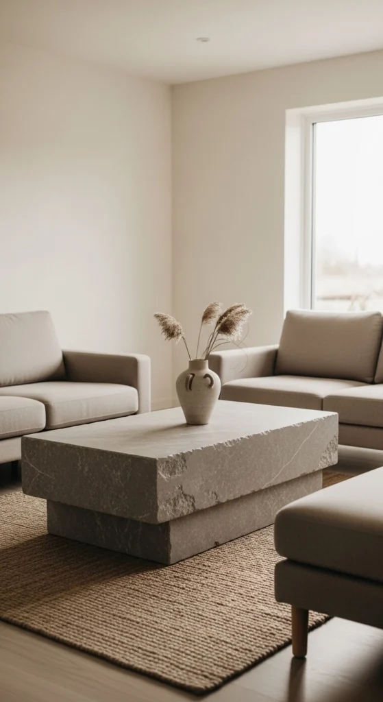 You do not need rare materials. Look for thick slabs or blocky forms. Faux stone finishes can work if the shape is right. Avoid thin legs or glass if you want a premium look.
