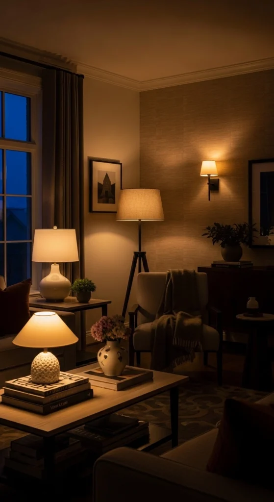 Start with table lamps. Place them at eye level when seated. Add a floor lamp near seating or corners. Wall lights bring warmth without taking floor space.