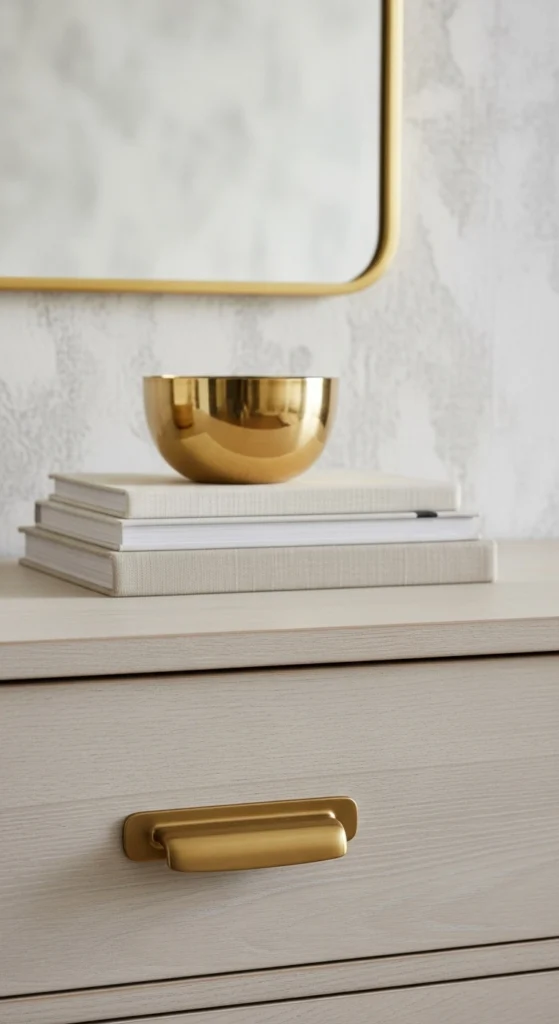 Think hardware, trays, or lamp bases. Warm tones work well with neutrals. Avoid mixing too many finishes.