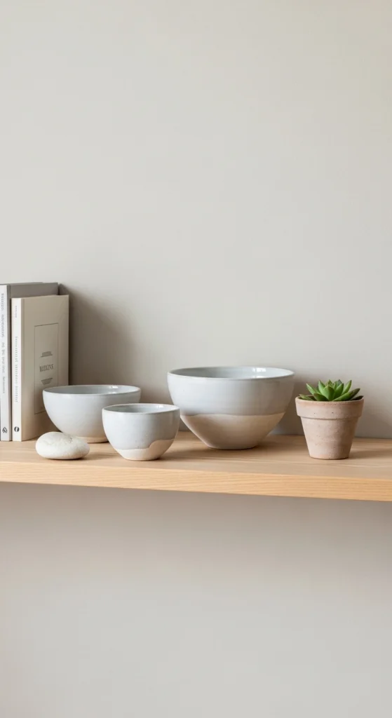 Budget tip: DIY clay trays or thrift rounded pottery. Imperfect shapes add softness without clutter.