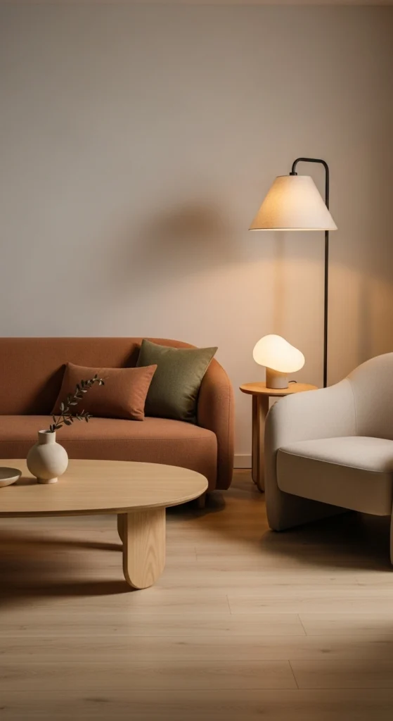 Hard edges create visual tension. Curved furniture slows the eye. Rounded sofas, oval tables, and arched floor lamps feel calmer in small spaces.