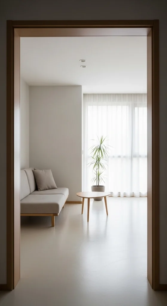 All-white rooms show every object. They feel unfinished. Add warmth through off-white, cream, or sand tones.