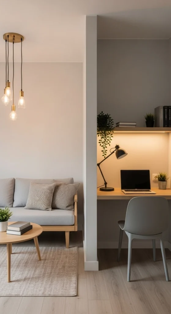A desk facing away from the sofa creates separation. A floor lamp can signal a reading corner. Keep each zone limited to its purpose.