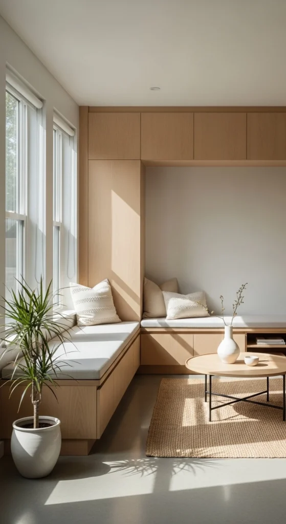 Visual clutter often comes from exposed storage. Closed cabinets and hidden bins calm a room instantly.