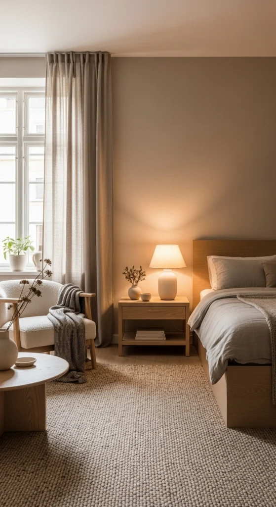 Warm neutrals calm a room without draining personality. Shades like mocha, clay, sand, and soft beige reduce harsh contrast. They allow the eye to rest. Start with paint or removable wallpaper if renting. Even one warm-toned wall can shift the mood.