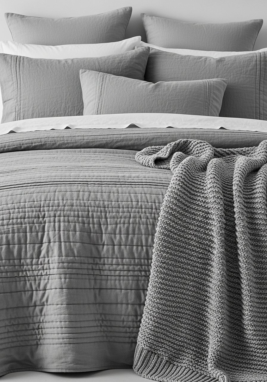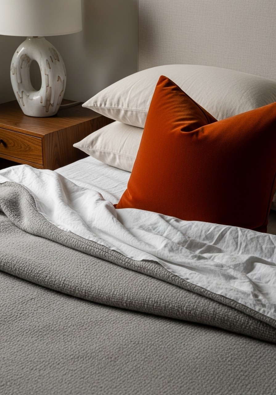 A single color in varying textures avoids visual boredom. I layered linen sheets, a quilted coverlet, and a knit throw in soft grey. I bought linen blend curtains to match the mood. Mistake to avoid: flat single fabric — always mix matte and nubby textures to keep the monochrome interesting.