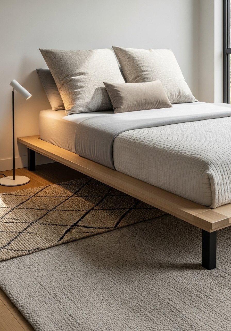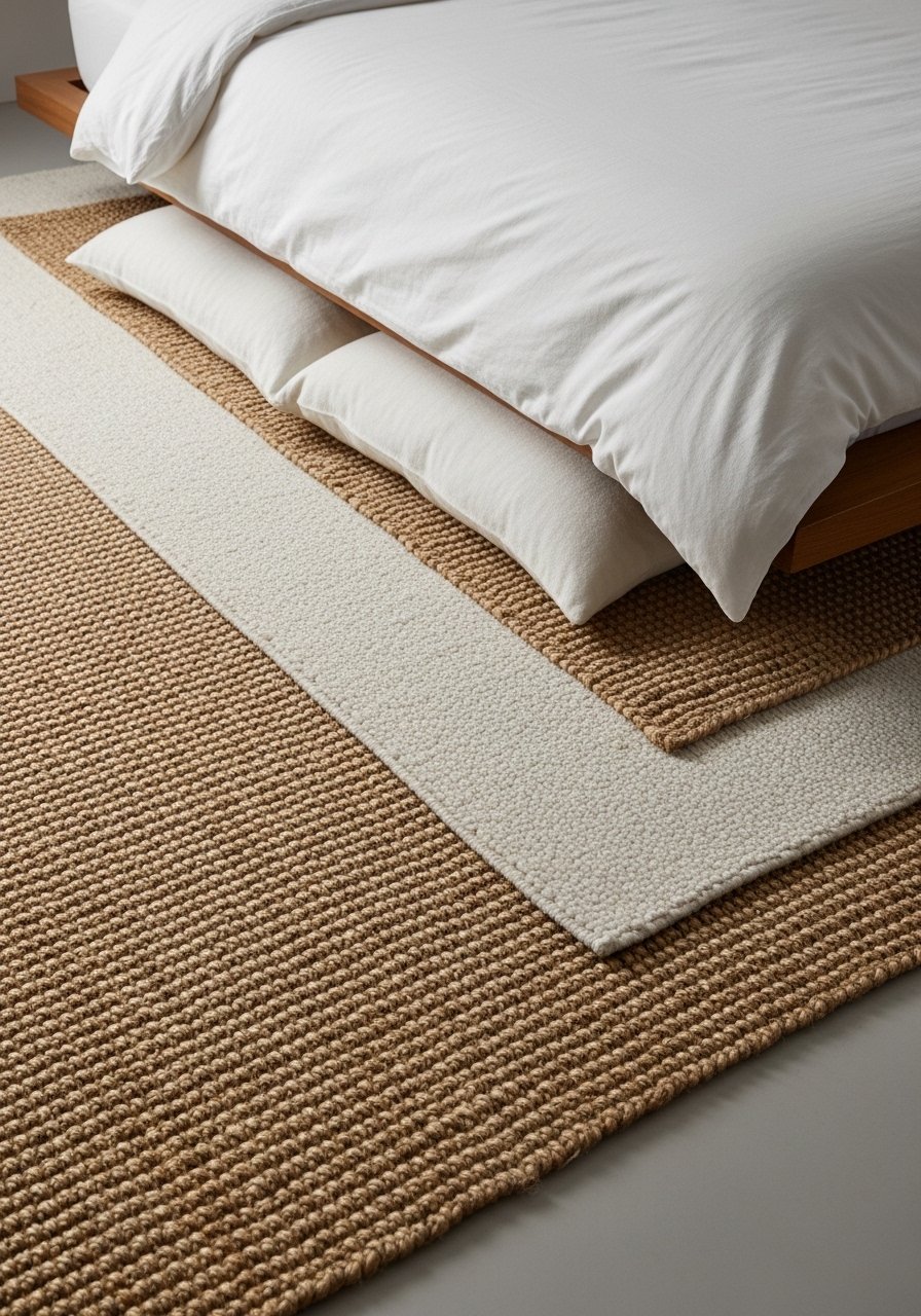 Layering a jute rug with a softer wool rug creates warmth and dimension. I used an 8×10 jute rug under a softer wool runner to define the bed area. Mistake to avoid: choosing rugs that clash in scale — keep the base rug large and the top rug proportionally smaller to frame the bed.