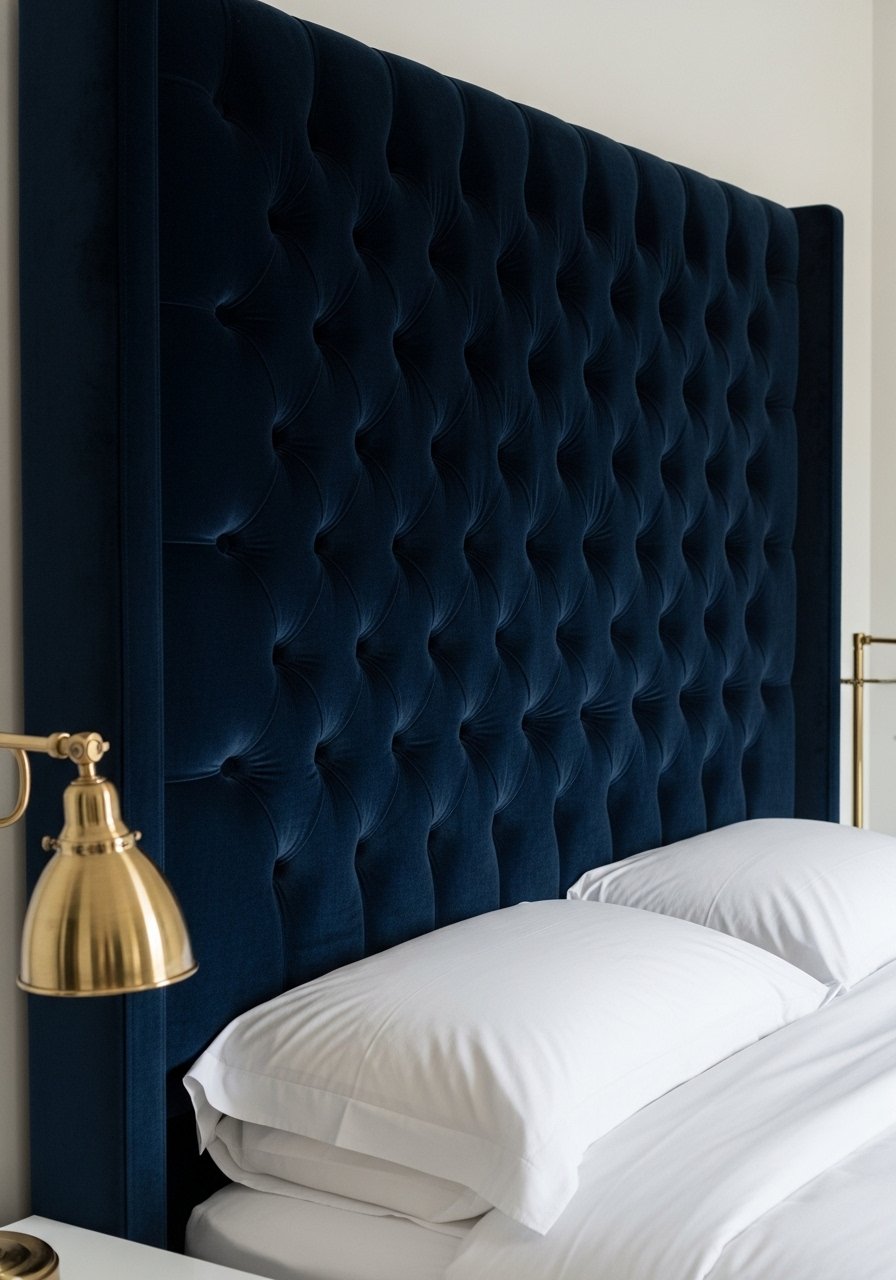 A deep velvet headboard reads luxe even in a small room. I installed a navy velvet headboard that anchors white linens and warm brass lighting. Try a navy velvet headboard with brass bedside lamps. Mistake to avoid: over-accessorizing the headboard — let it stand on its own and keep pillows simple to avoid visual clutter.