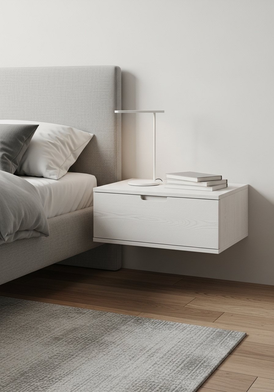 Floating nightstands open the visual floor space and read contemporary. I installed white oak floating shelves as nightstands and it made vacuuming easier too. Keep bedside lamps proportional — too-large fixtures overwhelm the floating look. Mistake to avoid: heavy decor on narrow shelves; keep items light and functional to maintain the clean silhouette.