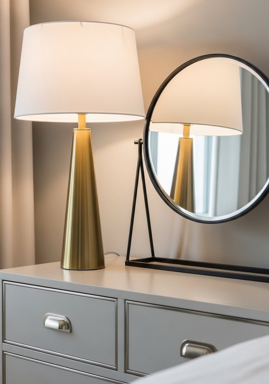 An oversized round mirror brightens a room more effectively than extra lamps. I mounted a 36-inch round mirror above my dresser and immediate light bounce improved. It also gives a hotel-like feel. Mistake to avoid: hanging it too high — the center should be roughly at eye level when standing to get the most visual impact.