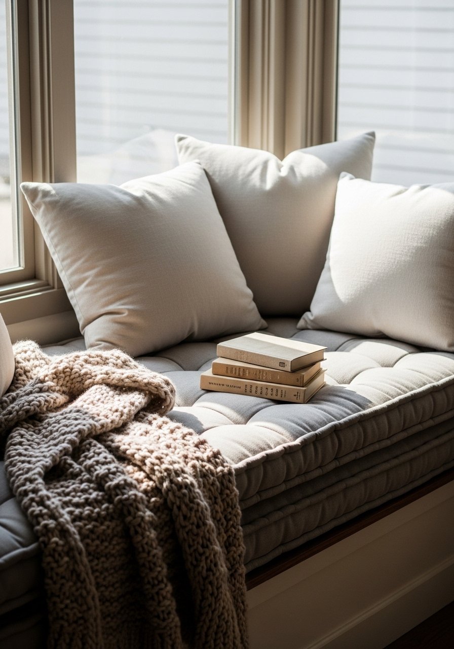 I turned a shallow window alcove into a tucked-in reading spot using layered cushions and a chunky throw. The key is varied textures: linen pillows, a knit throw, and a thin wool blanket. I used this chunky knit throw. Mistake to avoid: too many small pillows — use one large euro, one lumbar, and one accent for a neat look.