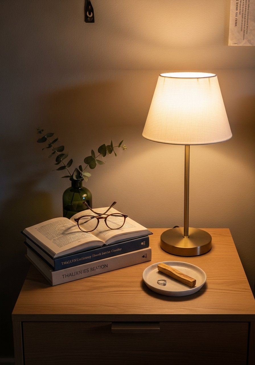 A tidy, curated nightstand reads luxe. I keep a slim lamp, ceramic tray, one book, and a small vase. Use a ceramic tray to corral items and a slim LED lamp. Mistake to avoid: piling eight items — aim for three to five pieces and negative space for an editorial look.
