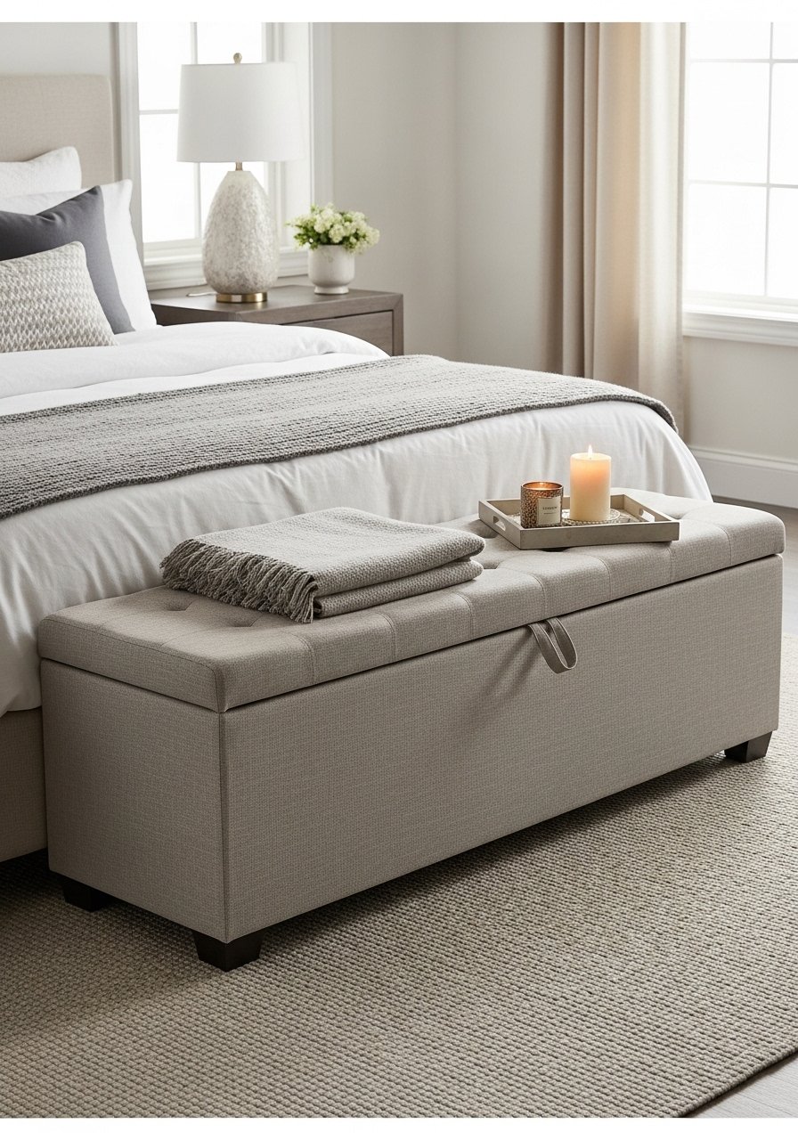 A slim storage bench hides extra bedding and keeps the look tidy. I chose an upholstered bench with internal storage and a neutral fabric to keep the profile modern. I store seasonal blankets in underbed storage bins too. Mistake to avoid: bench too deep — keep it under 18 inches for comfortable circulation at the foot of the bed.