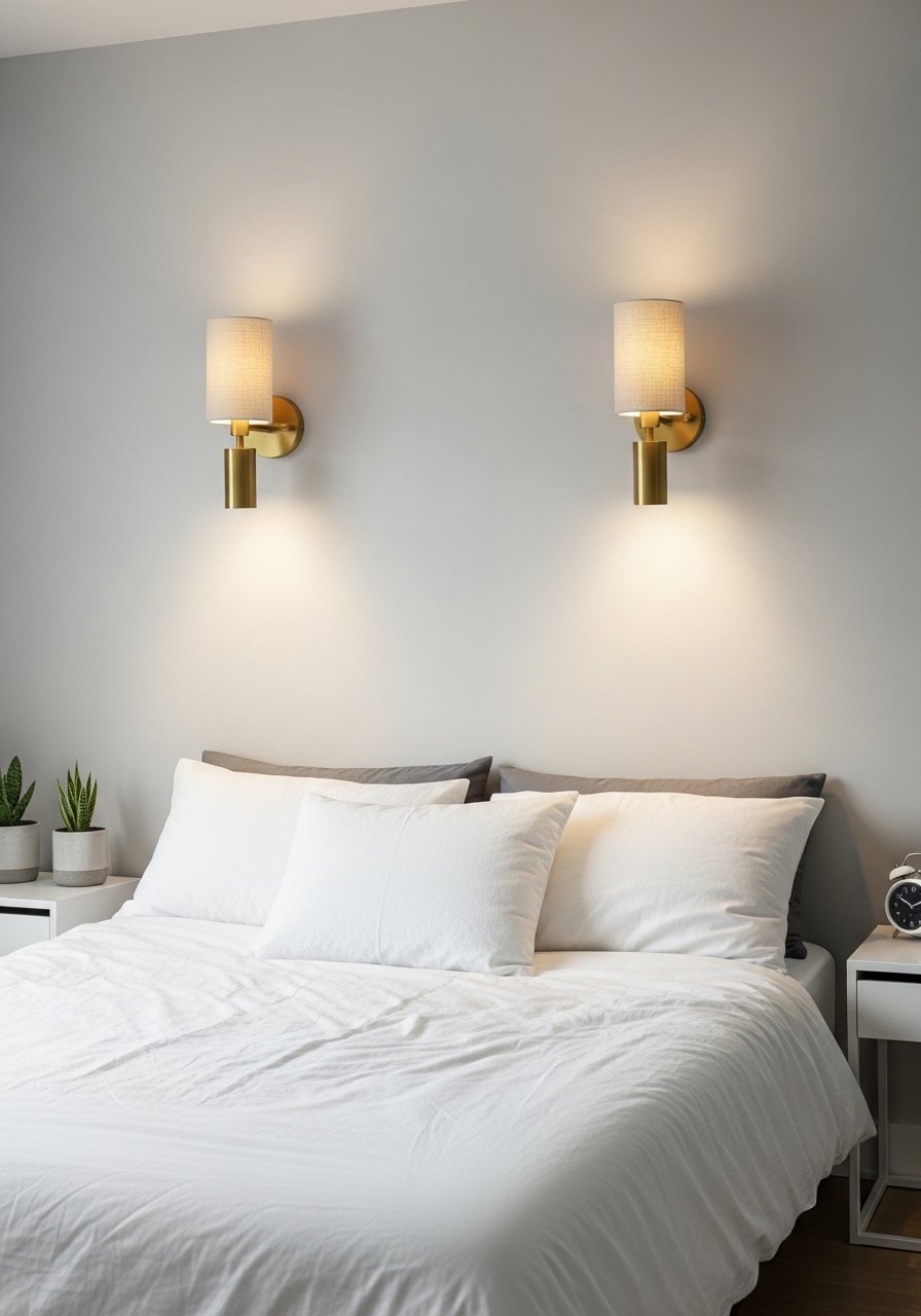 Wall sconces free up nightstand surfaces and read very designed. I installed adjustable brass sconces and they replaced bulky lamps. I recommend brass wall sconces with swivel arms. Mistake to avoid: mounting too low — sconce centers should be about 48-52 inches from the floor to work with most beds.