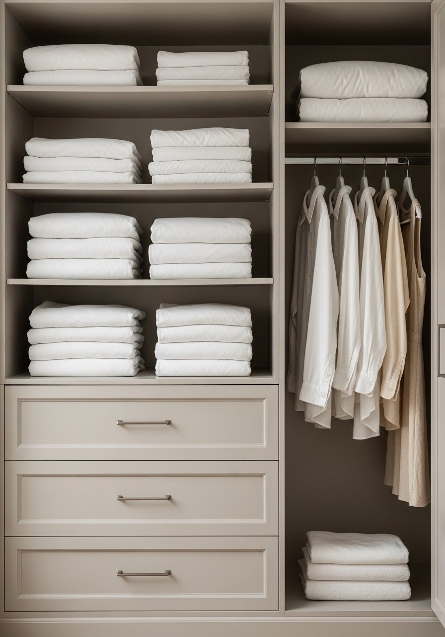 Decluttering my closet with a simple organizer changed how the bedroom felt. Open shelving and pull-out drawers in white oak read clean and modern. I suggest modular closet organizer kits. Mistake to avoid: too many small compartments — keep larger shelving for visible storage and a few closed drawers for smaller items.