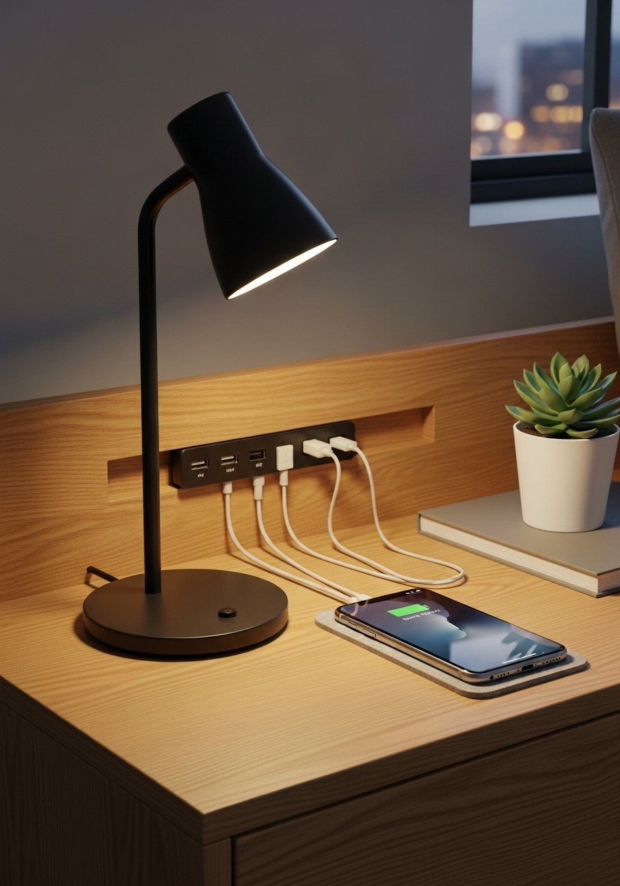 Adding a USB-charging nightstand made nightly routines smoother. I used a slim charging hub tucked behind my lamp and routed cables through the table. I recommend USB bedside charging station. Mistake to avoid: visible cables — use cable clips or integrated holes for a tidy look.