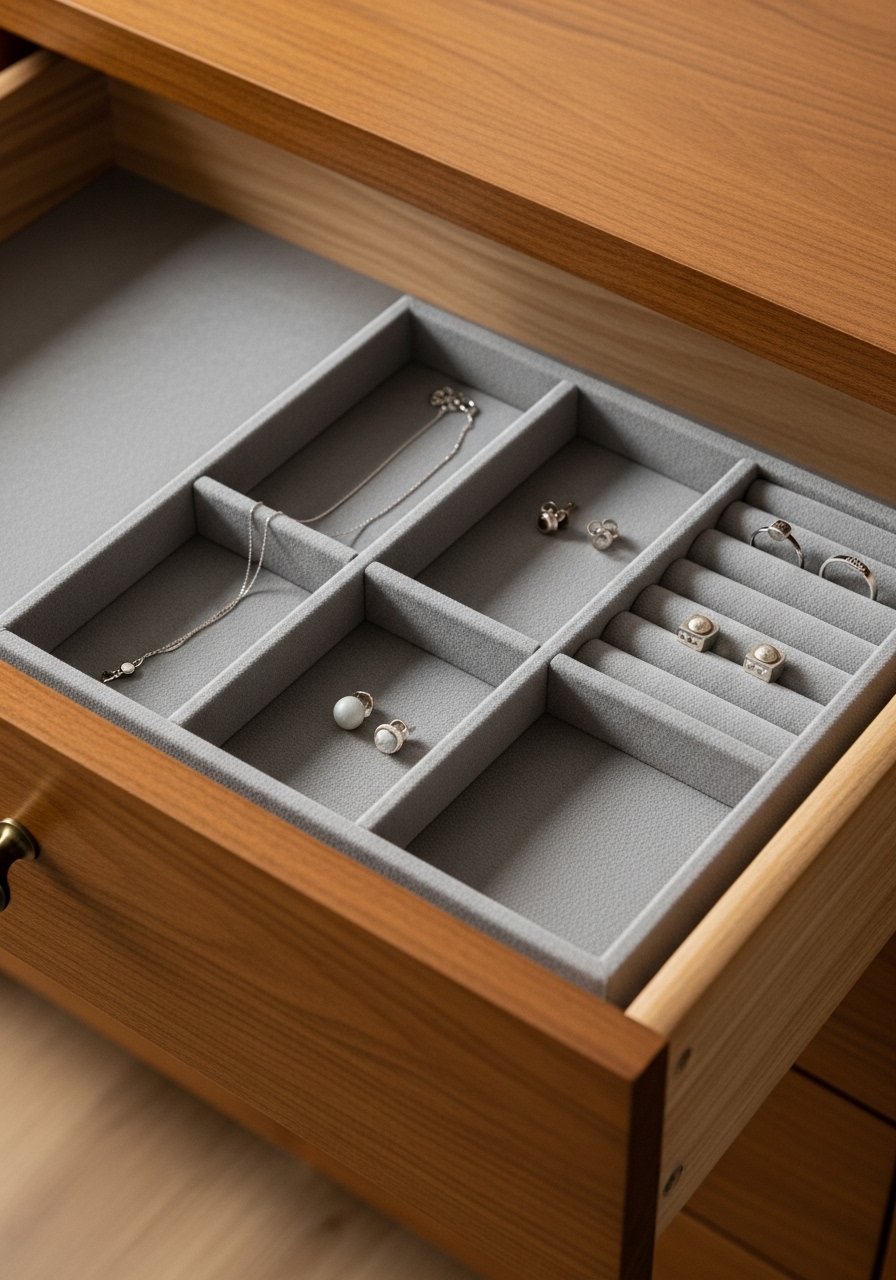A velvet-lined jewelry tray keeps small items organized and feels indulgent daily. I keep mine in the top drawer of my dresser for easy access. Try velvet jewelry drawer organizers. Mistake to avoid: jewelry mixed in with clothing — use a dedicated tray to avoid tangles and scratches.