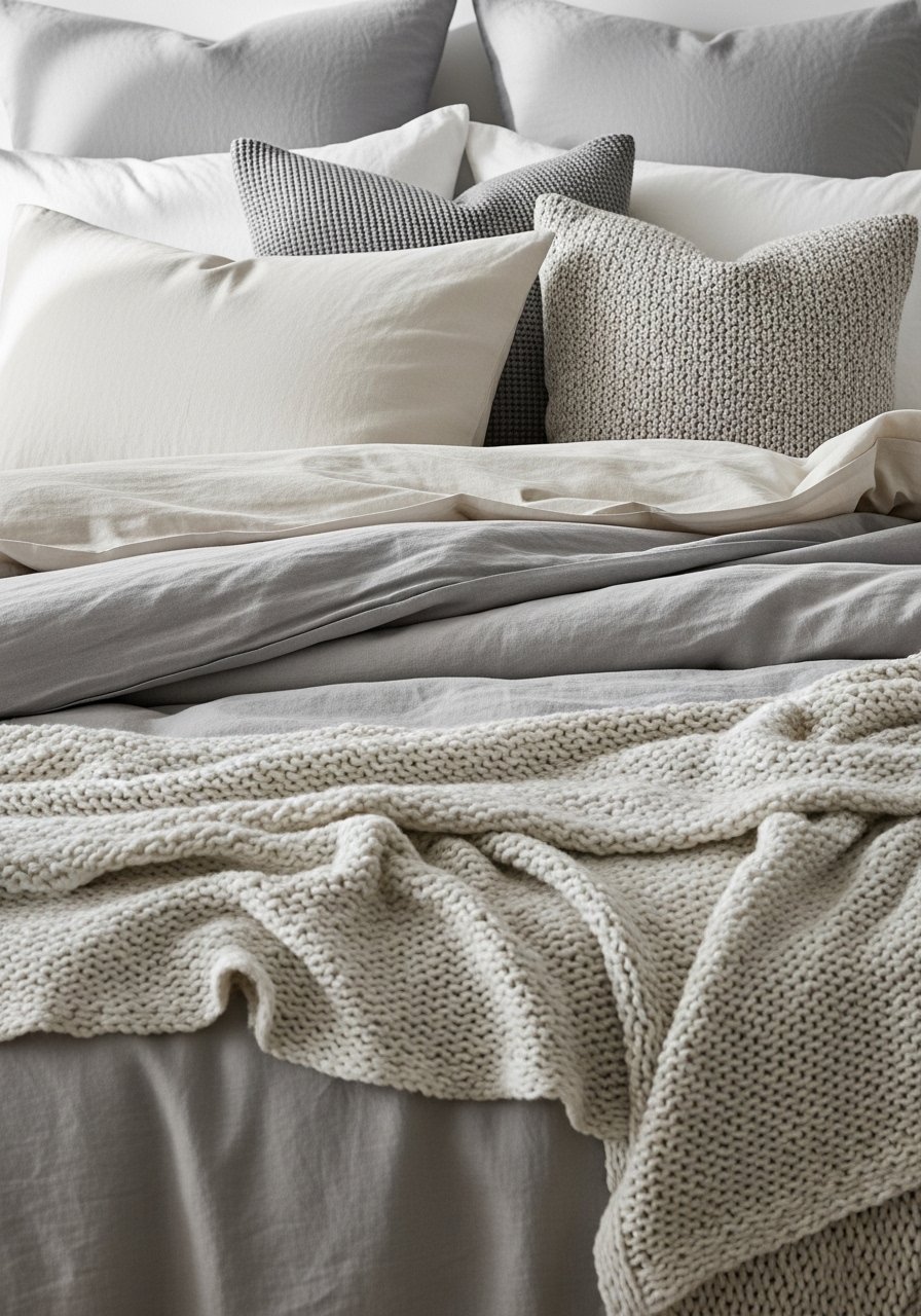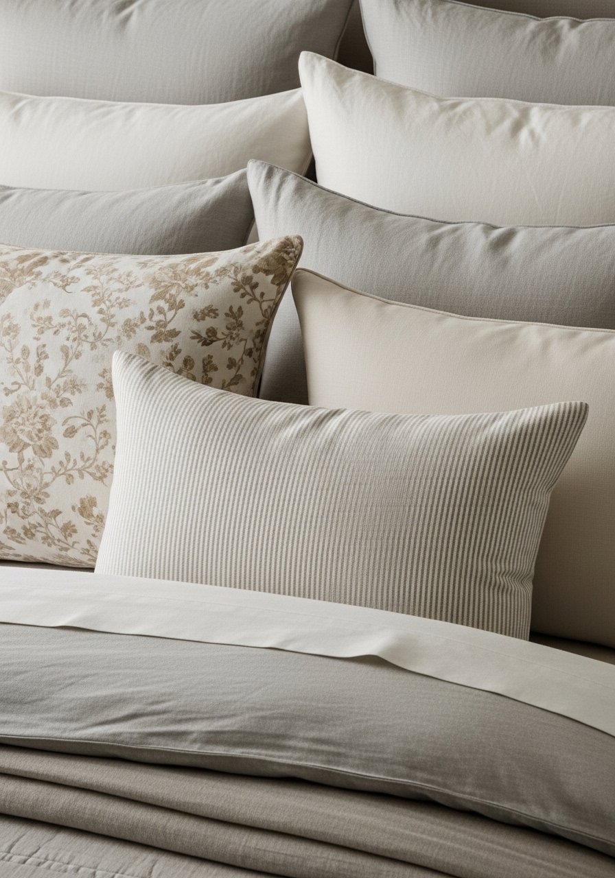 Mixing low-contrast patterns—thin stripes, micro-checks, and small-scale florals—keeps the eye engaged without loud color. I layered a neutral striped duvet with two patterned pillows and a solid lumbar. Avoid large graphic prints that dominate the palette. The subtle pattern play reads calm but lived-in, and it stopped my room from looking flat while maintaining a soothing, neutral scheme.
