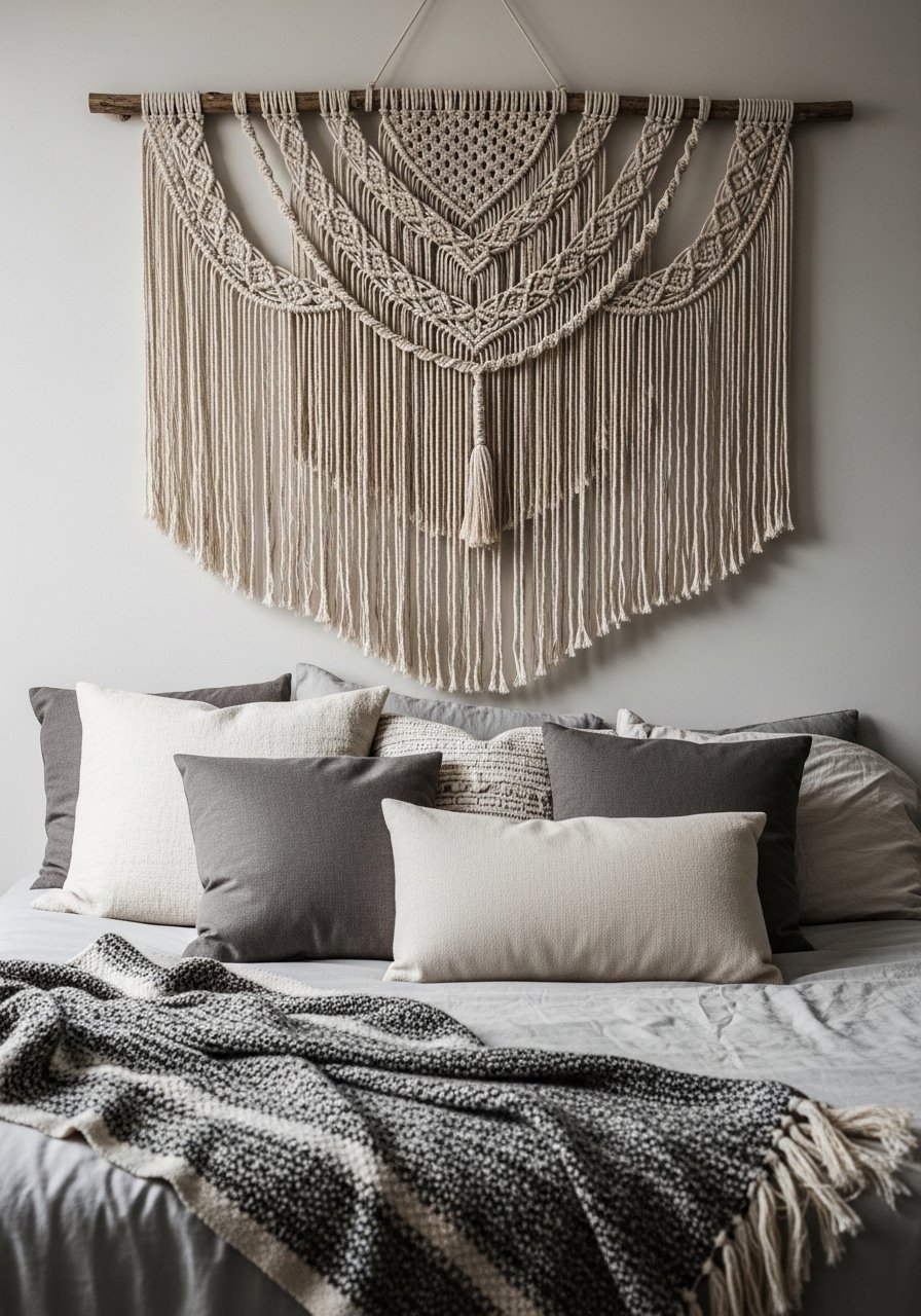 A handwoven macramé piece adds organic pattern without heavy contrast. I hung a cream macramé above the headboard to introduce subtle movement and texture. Try neutral macrame wall hangings. One mistake is choosing a piece that’s too colorful; keep it tonal so it complements linens. This small addition makes the wall feel curated and cozy without stealing focus from the bed.