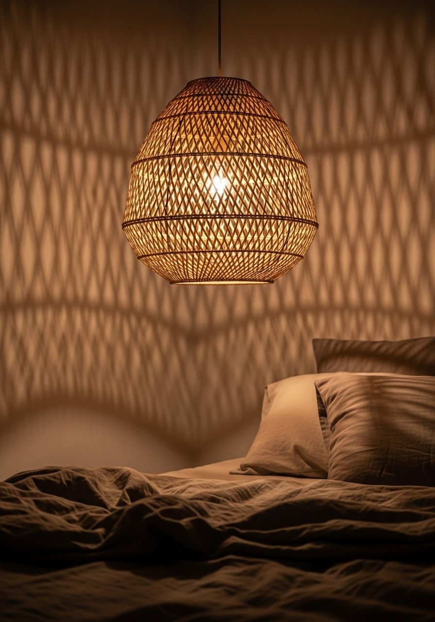 A woven rattan pendant creates soft patterned light and an organic focal point. I swapped a glass ceiling fixture for rattan pendant shades and noticed the room instantly felt more relaxed. Avoid fixtures that are too ornate; simple woven shapes read modern. The natural material pairs well with linen and wood, giving the bedroom a gentle, grounded atmosphere that helps me unwind.