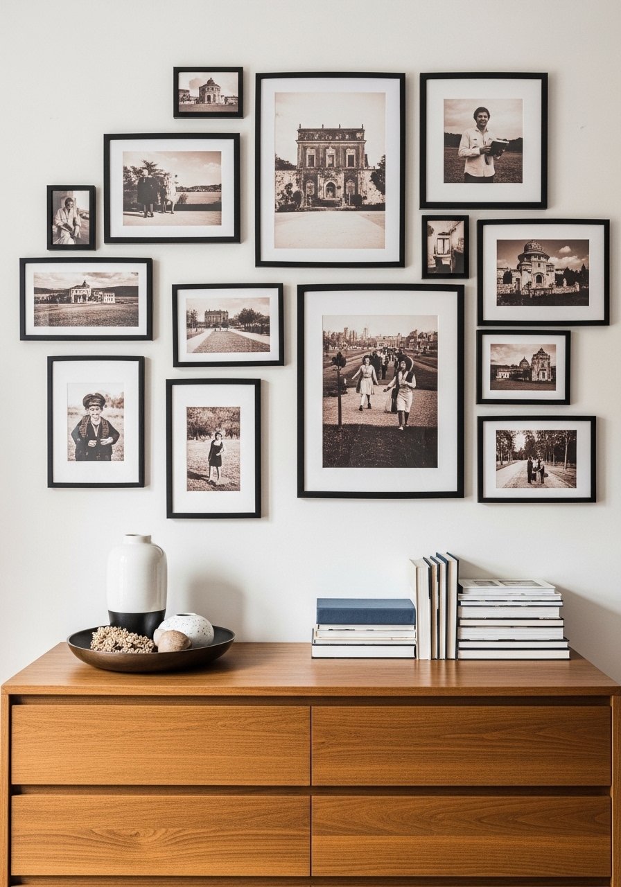 I curated a gallery of neutral art prints in mismatched black frames for gentle contrast. Using odd-numbered groupings and varied sizes makes the layout feel intentional. I used mixed black frames set with white mats for cohesion. Don’t overcrowd the wall; leave breathing space. The black frames anchor the neutrals and prevent the room from feeling washed out while keeping a calm, minimalist vibe.