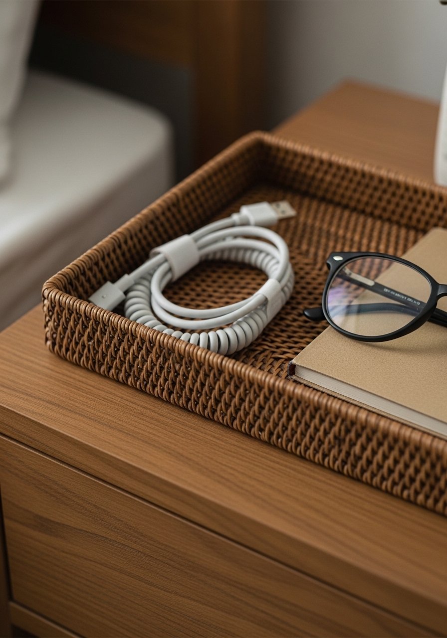 I concealed charging cables in a woven rattan tray to keep surfaces serene. A tidy tray hides tech and corralled items. I use woven catchall trays and a slim multi-port charger tucked under the nightstand. Avoid leaving multiple cords visible across the tabletop. This small change stopped visual noise and made the bedside feel like a calm landing zone for sleep.