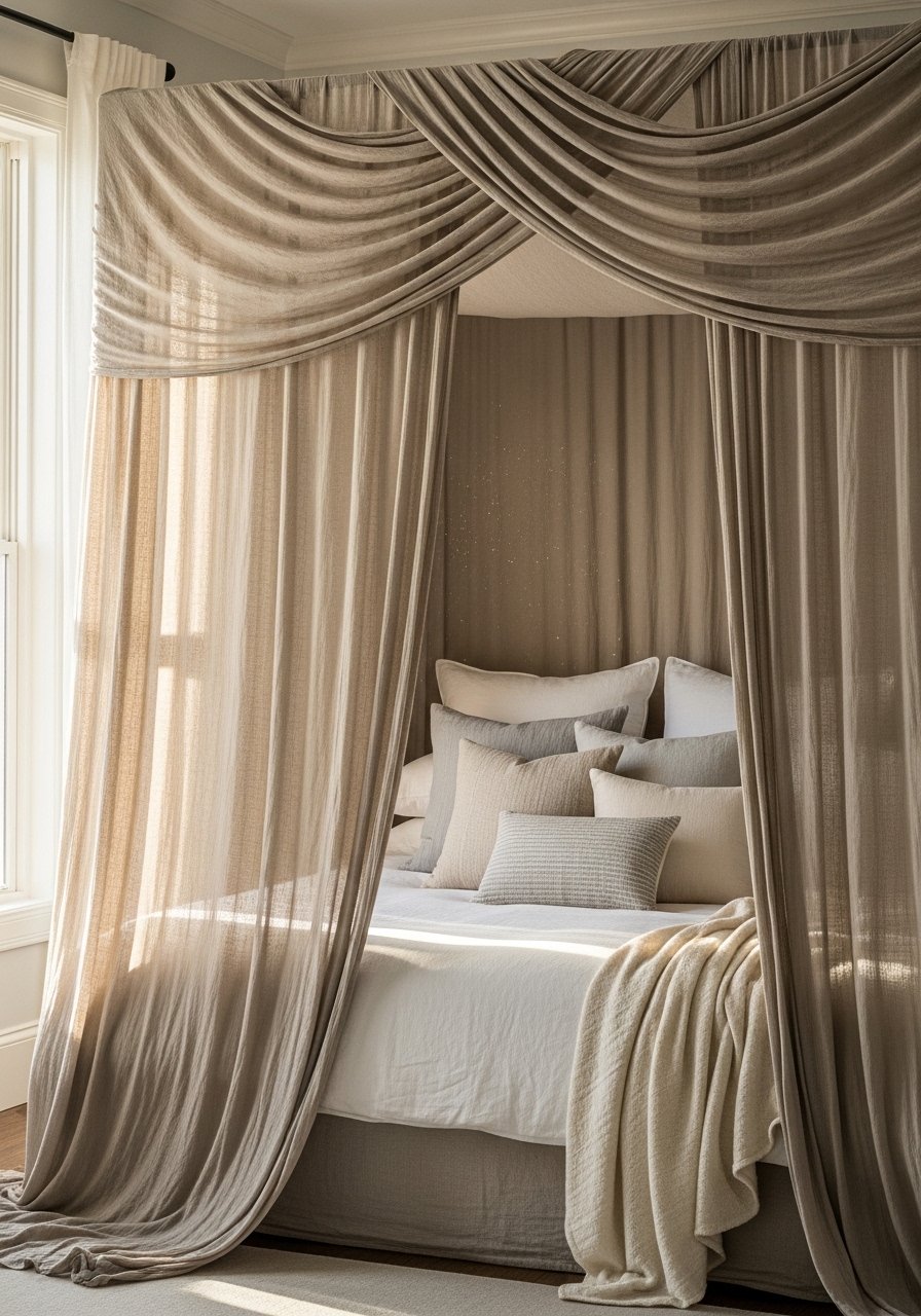 A sheer linen canopy gives the bed a soft, sheltered feel without heaviness. I anchored mine to a ceiling hook and let fabric drape loosely. Use linen canopy panels in off-white or sand. Avoid heavy drapes that trap heat. The canopy made the bed feel like a private nook and helped me relax faster on nights when I needed a sense of enclosure.