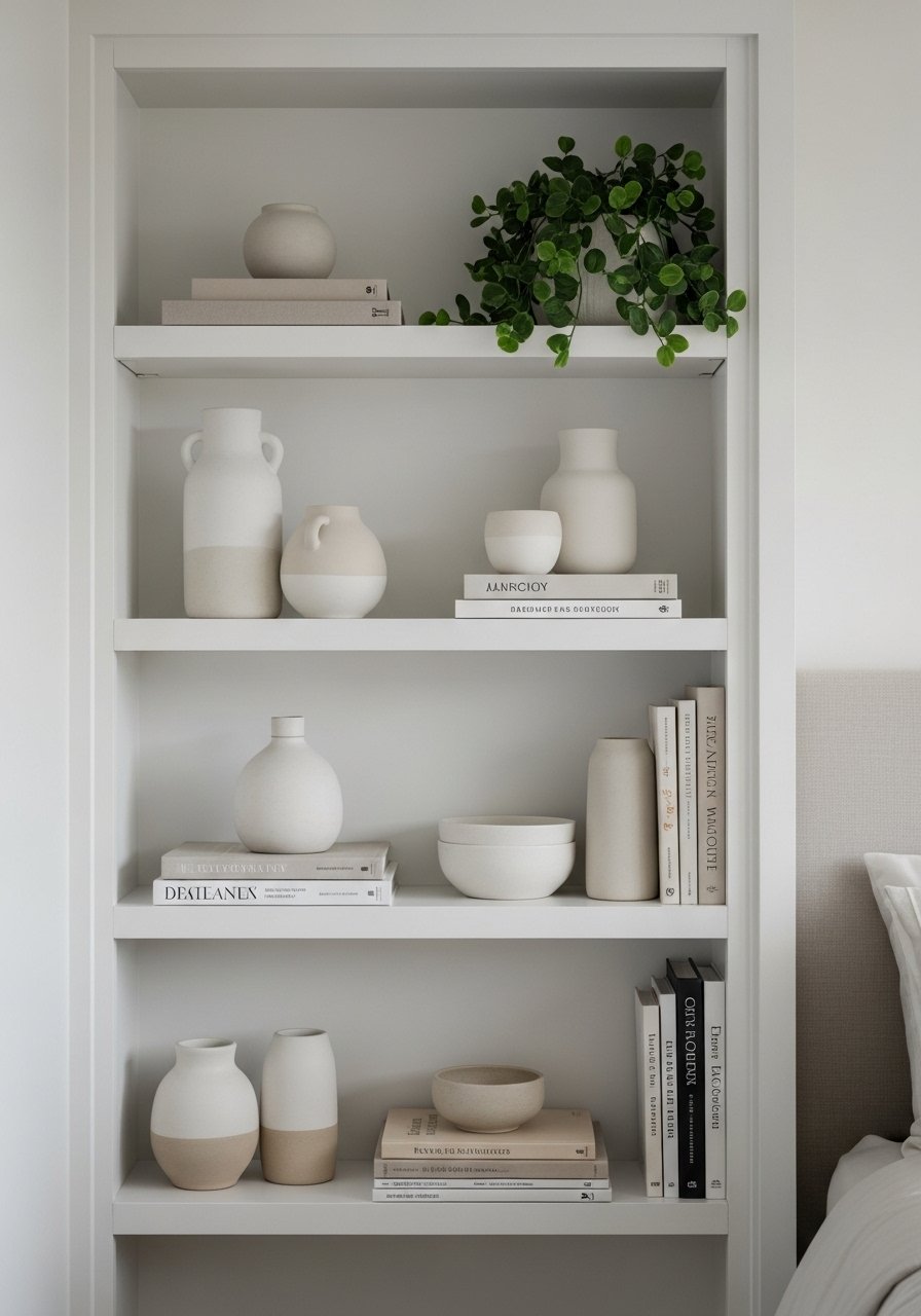 Built-in shelves keep clutter off surfaces and provide a place for curated items that make a room feel personal. I styled mine with a few ceramics, neutral books, and a small potted snake plant. Avoid filling every shelf; negative space is calming. Thoughtful shelving creates an edited look and provides easy access to calming reads and a bedside lamp without overwhelming the eye.